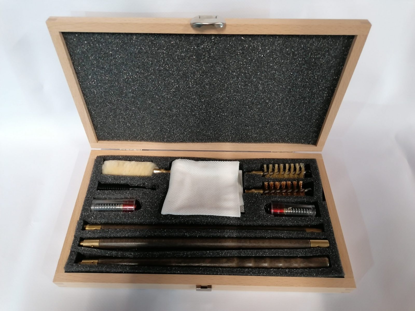 Enfield 12g Deluxe Nylon Plastic Shotgun Cleaning Kit Wooden Case features the following